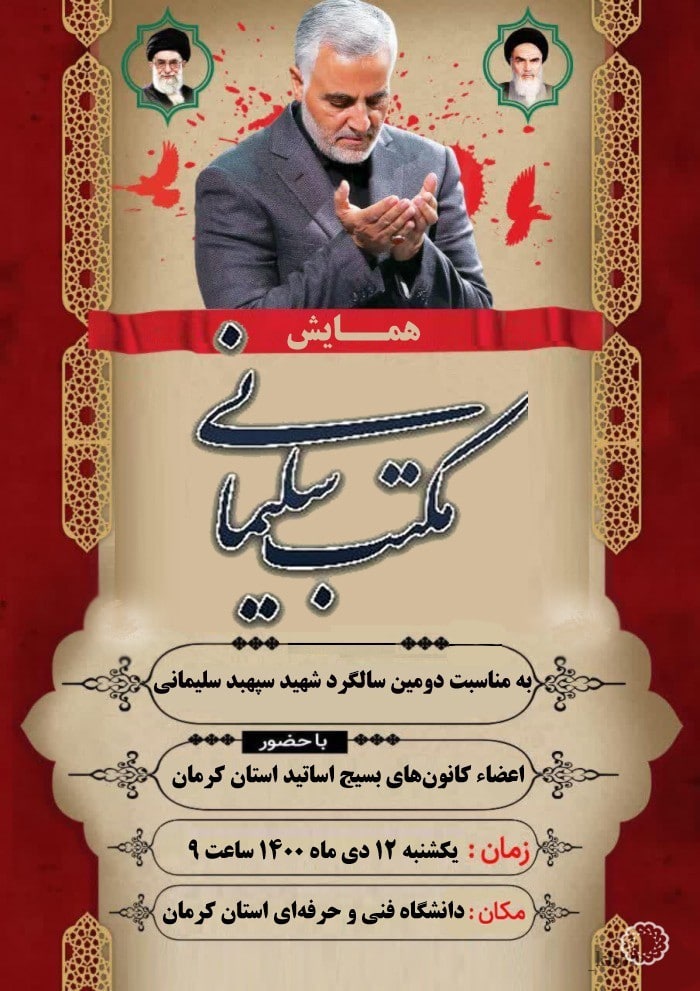 همایش مکتب سلیمانی به مناسبت دومین سالگرد شهید سپهبد سلیمانی با حضور اعضای کانون های بسیج اساتید استان کرمان زمان: ...