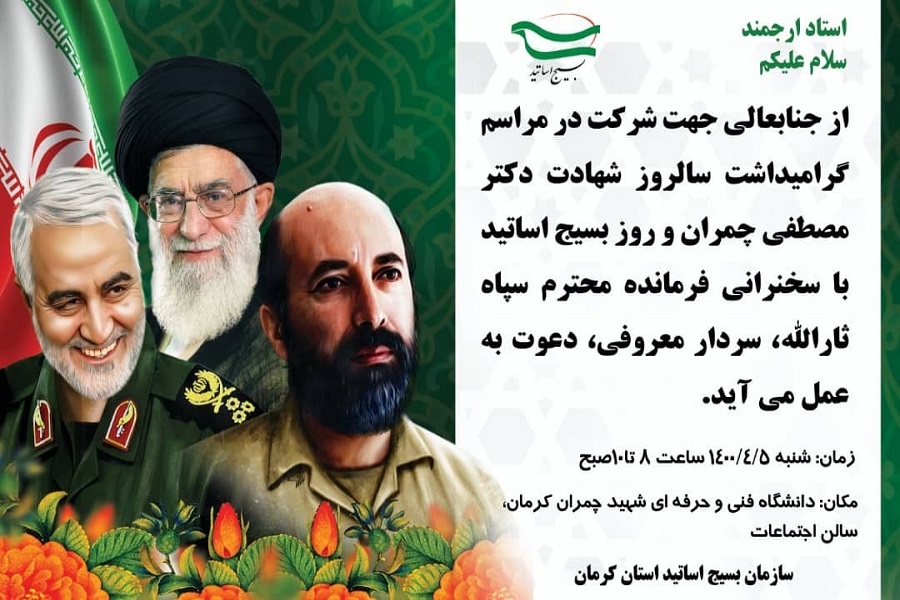 دعوت جهت شرکت در مراسم گرامیداشت سالروز شهادت دکتر مصطفی چمران و روز بسیج اساتید استاد ارجمند سلام علیکم از ...