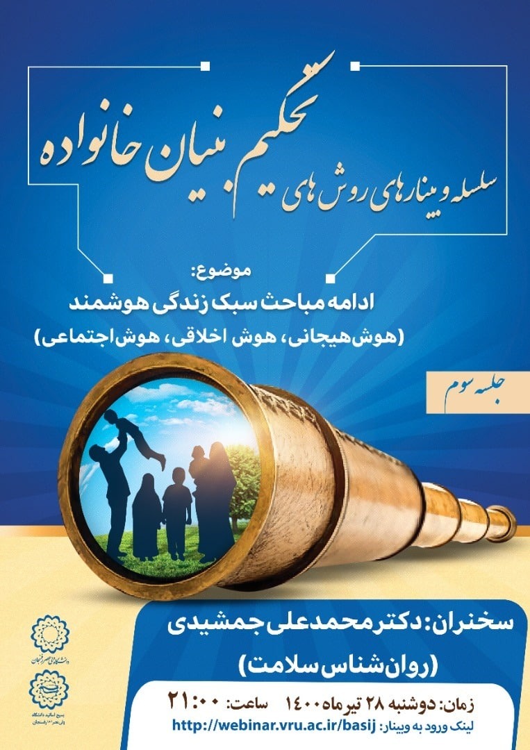 سلسله وبینارهای روش های تحکیم بنیان خانواده جلسه سوم موضوع: ادامه مباحث سبک زندگی هوشمند (هوشهیجانی، هوش اخلاقی، هوشاجتماعی) سخنران: ...