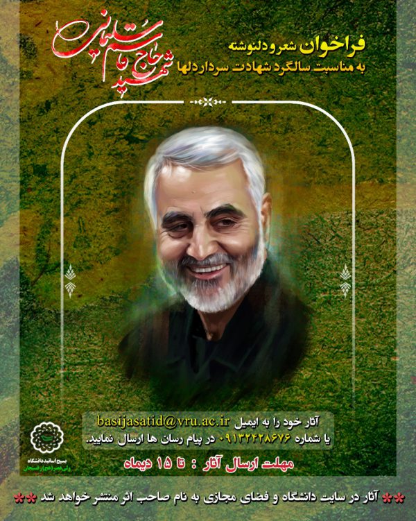 فراخوان شعر و دلنوشته به مناسبت سالگرد شهادت سردار دلها شهید حاج قاسم سلیمانی آثار خود را به basijasatid@vru.ac.ir ایمیل ...